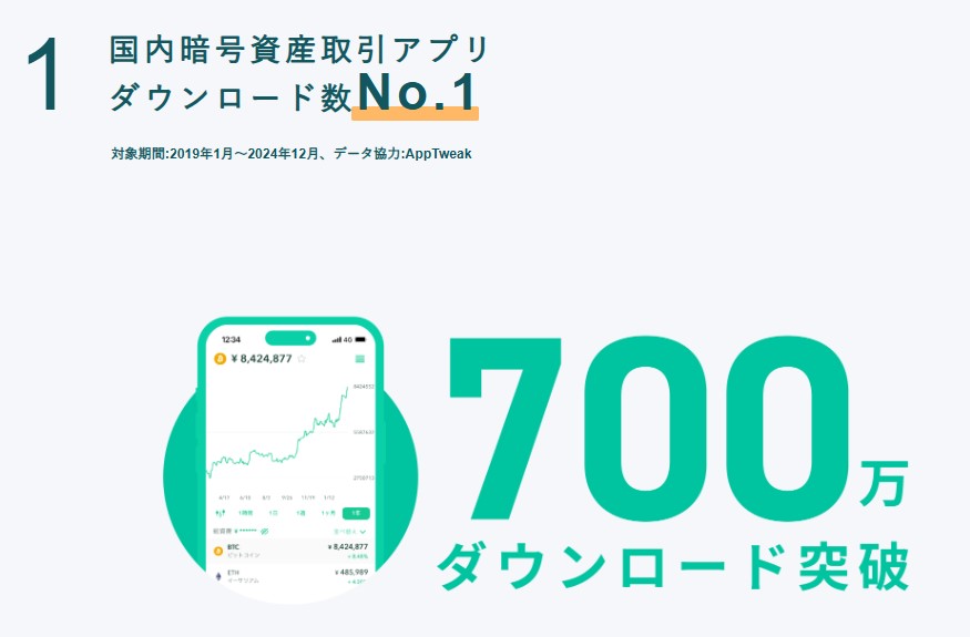 ❶コインチェック 6年連続アプリDL数 NO.1 追記(*対象:国内暗号資産取引アプリ、データー協力元:AppTweak)